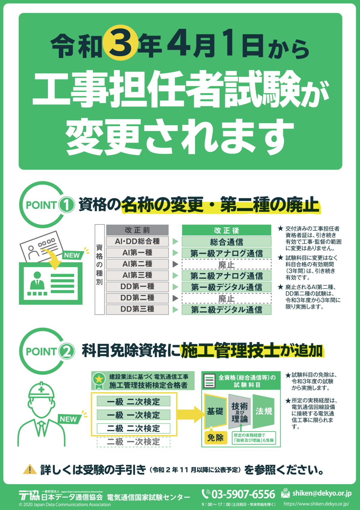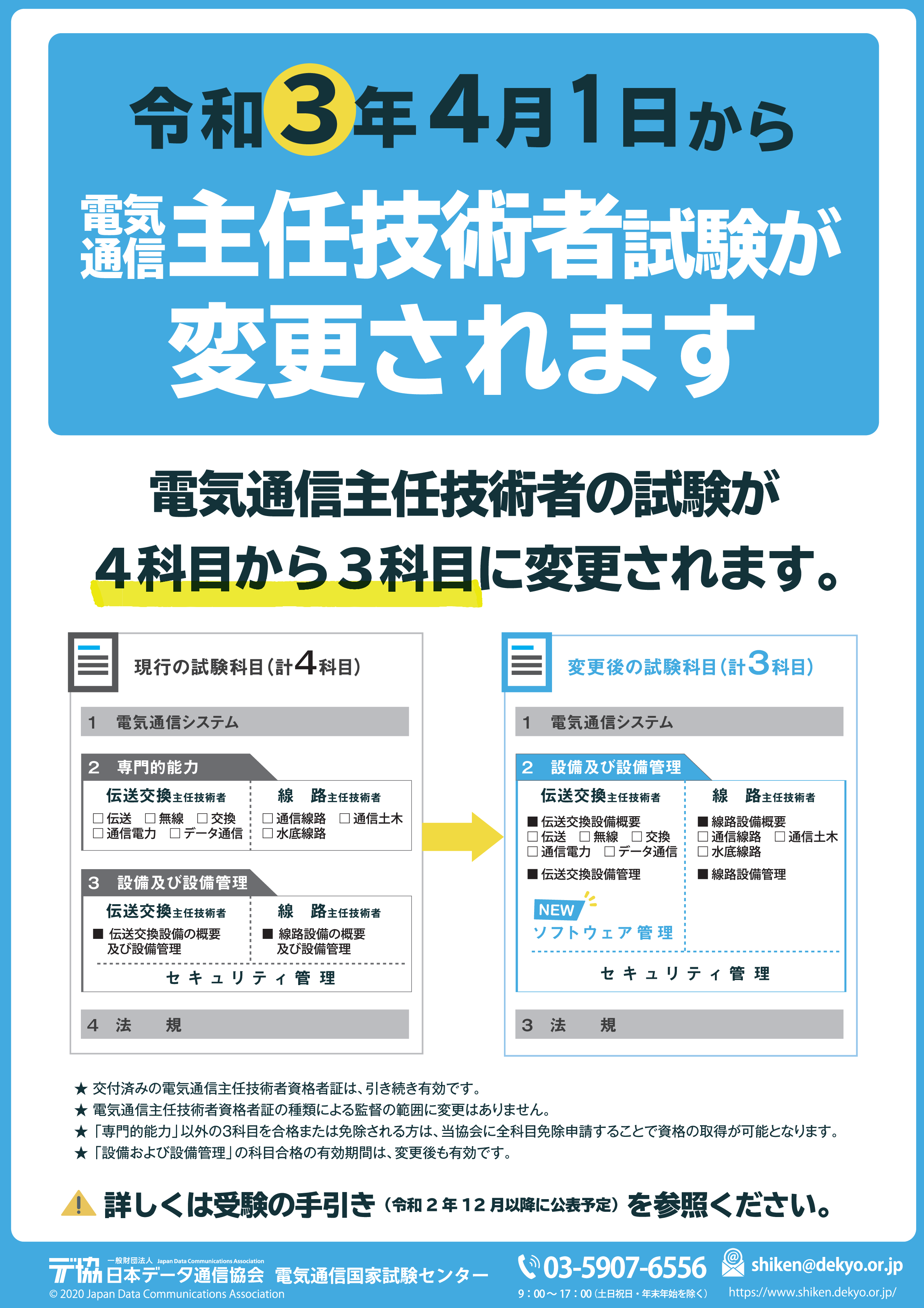 日本データー通信協会から工事担任者・電気通信主任技術者の試験の変更のパンフレットが発表されてました。